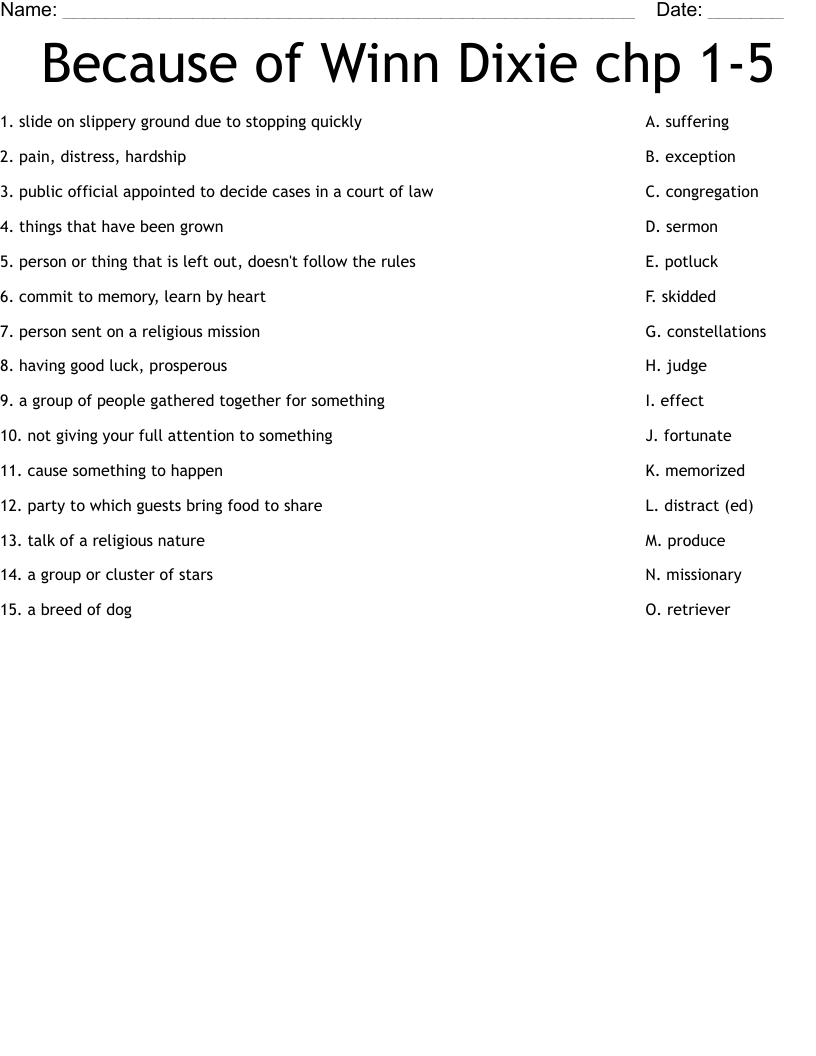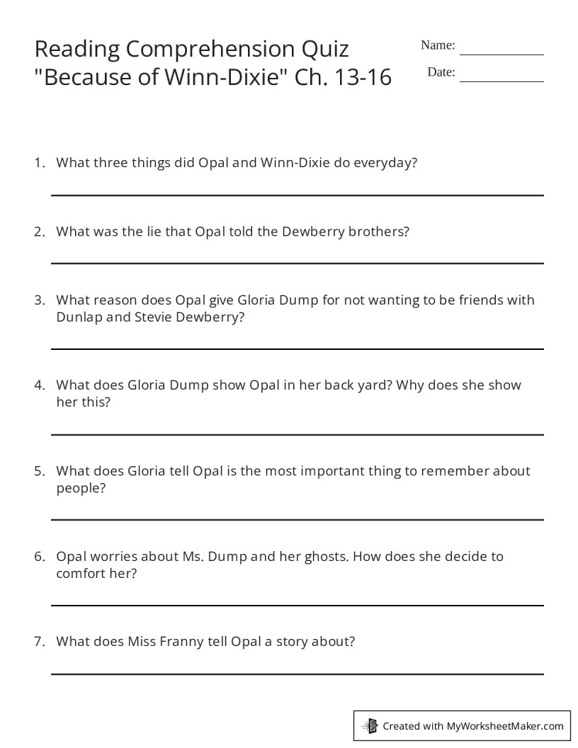 Reading Comprehension Quiz Because Of Winn Dixie Ch 13 16 My Worksheet Maker Create Your Own Worksheets