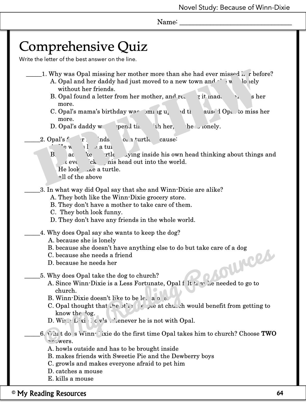 Because Of Winn Dixie Comprehensive Quiz My Reading Resources