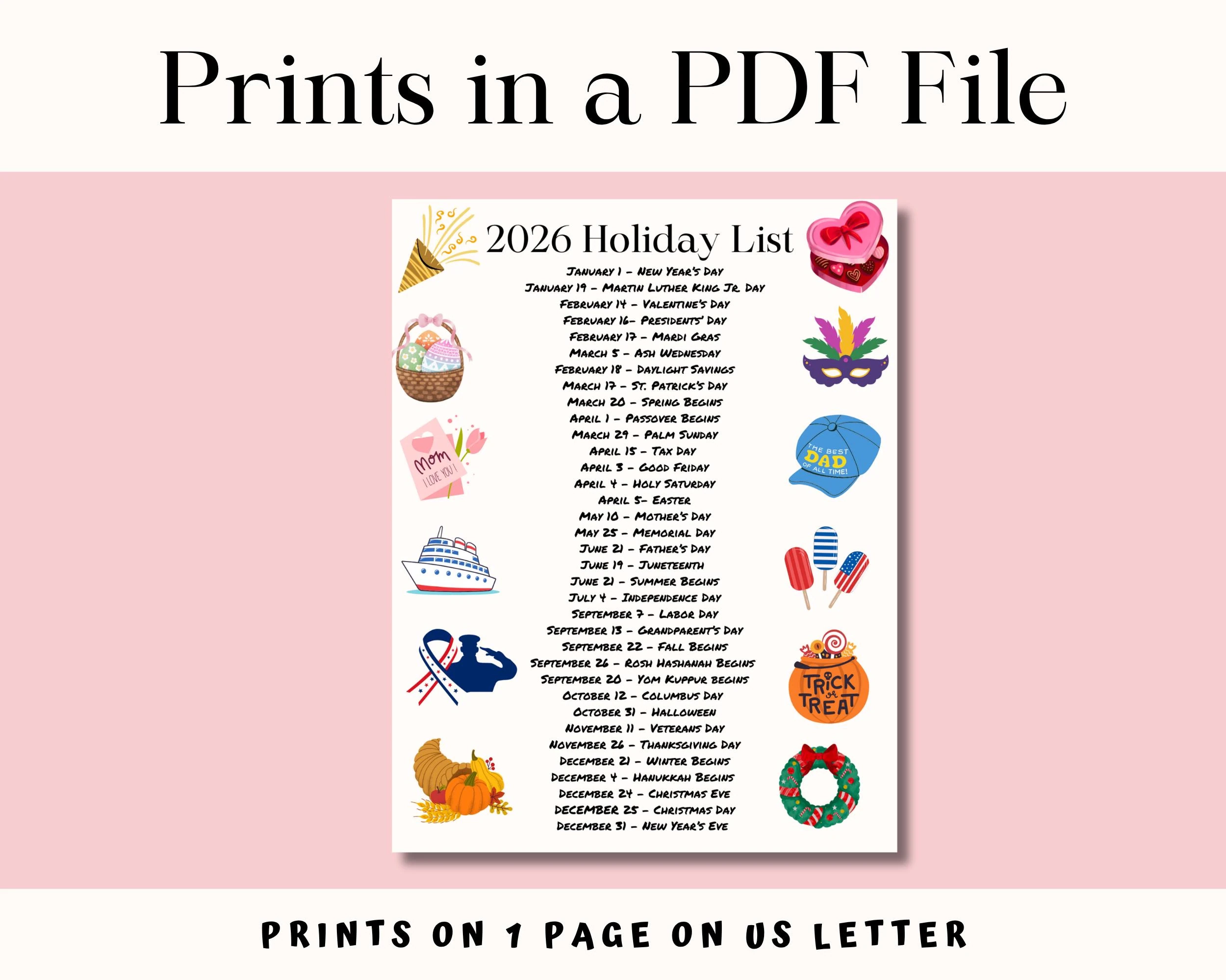 2026 Holiday List Printable One page Calendar PDF Download Etsy