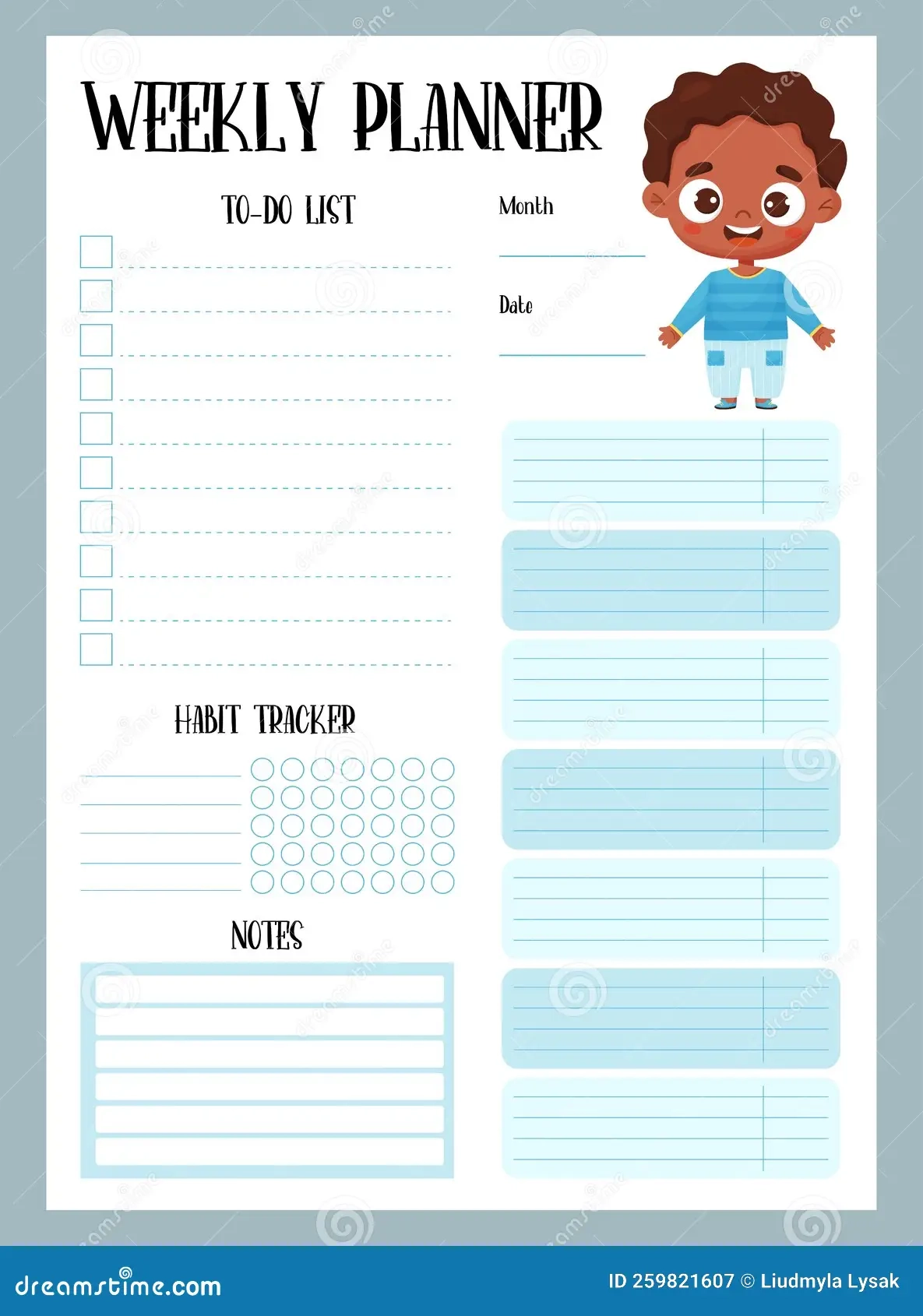 Weekly Planner Organizer To do List Notes And Habit Tracker With Cute Cartoon Black Ethnic Boys Vector Vertical Template For Print Design Decor Stock Vector Image Art Alamy