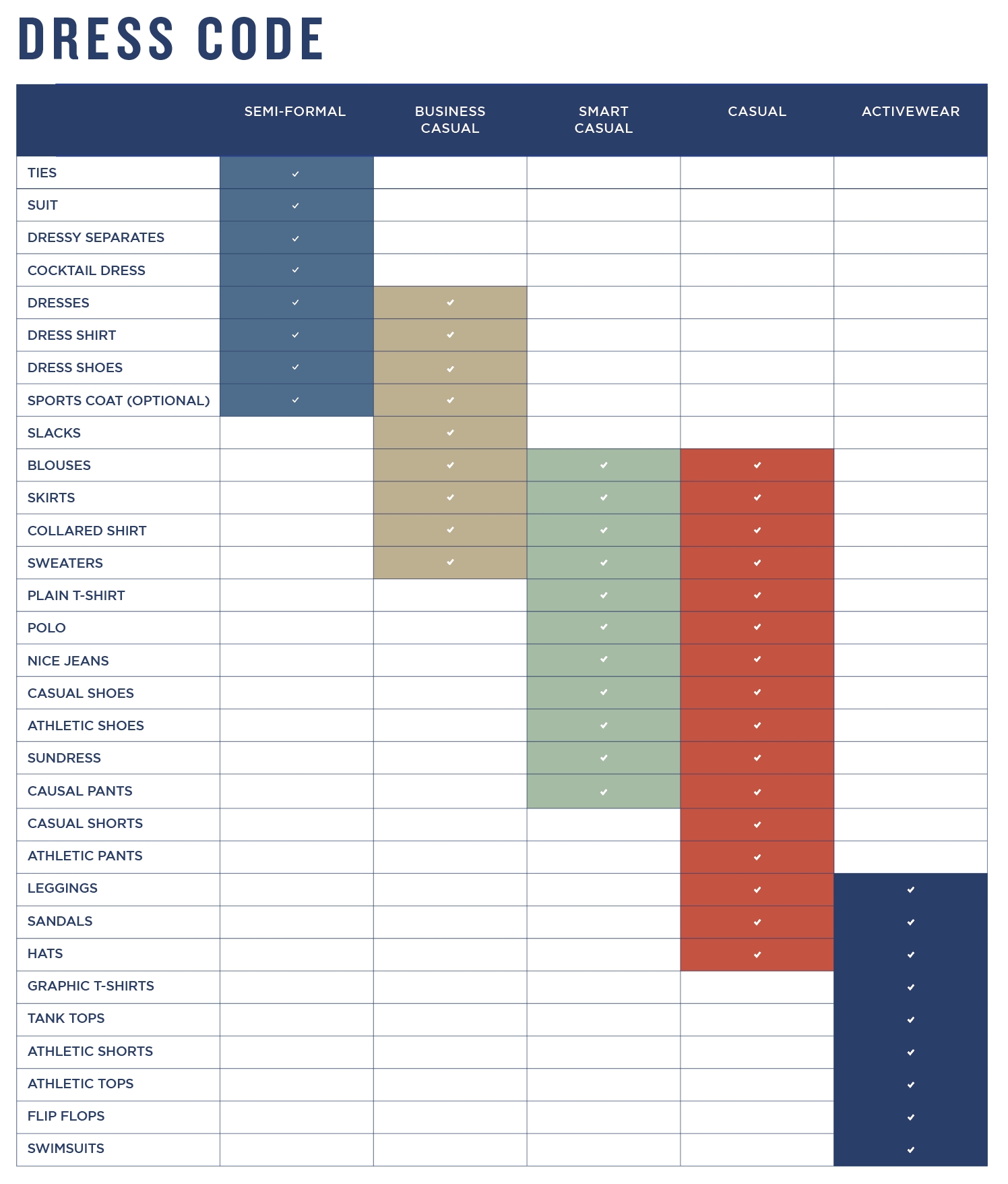 Whether you’re heading to work, a casual weekend brunch, or a fancy dinner party, having a dress etiquette chart printable can make all the difference. No more second-guessing yourself or feeling underdressed. With a quick glance at the chart, you’ll be ready to conquer the day in style.