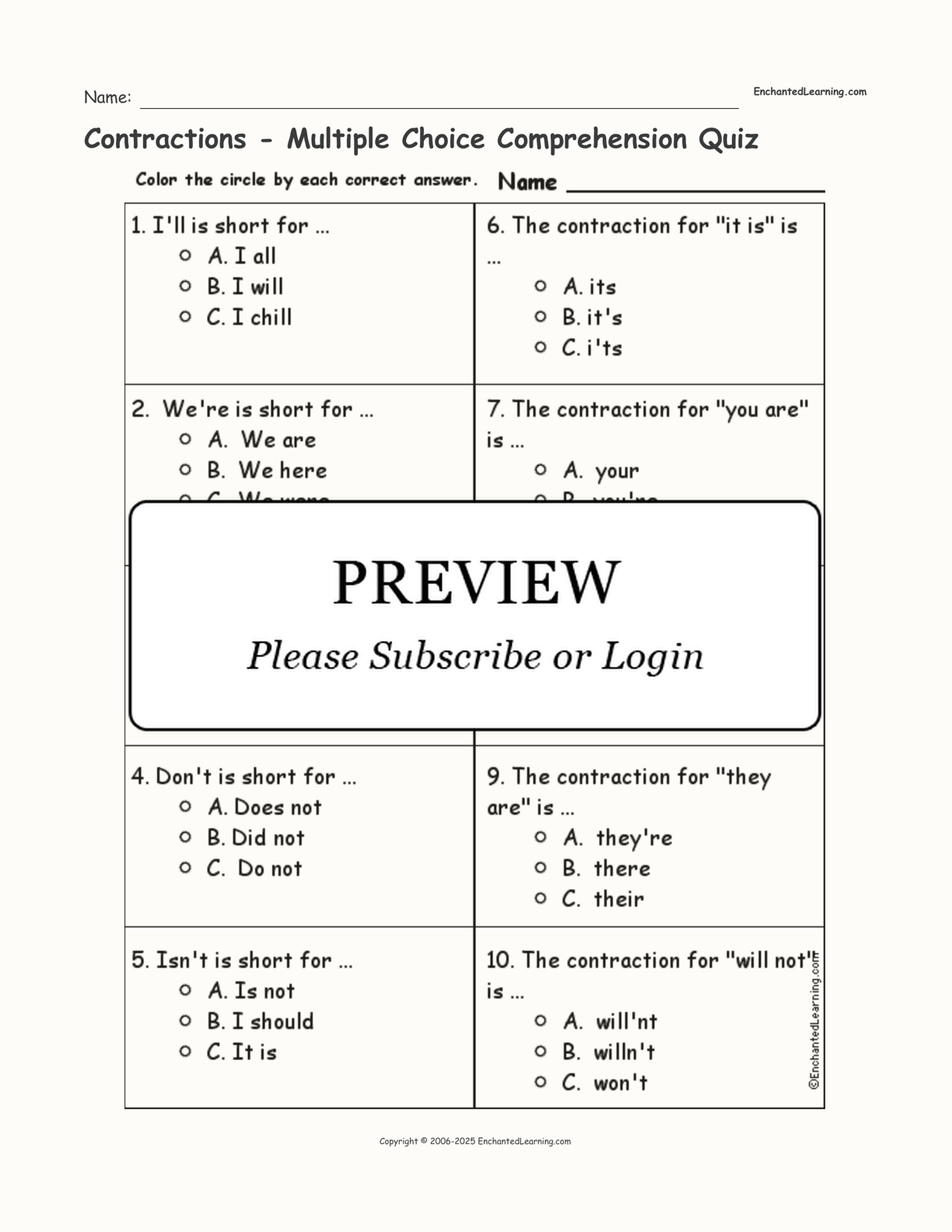 Contractions Multiple Choice Comprehension Quiz Enchanted Learning