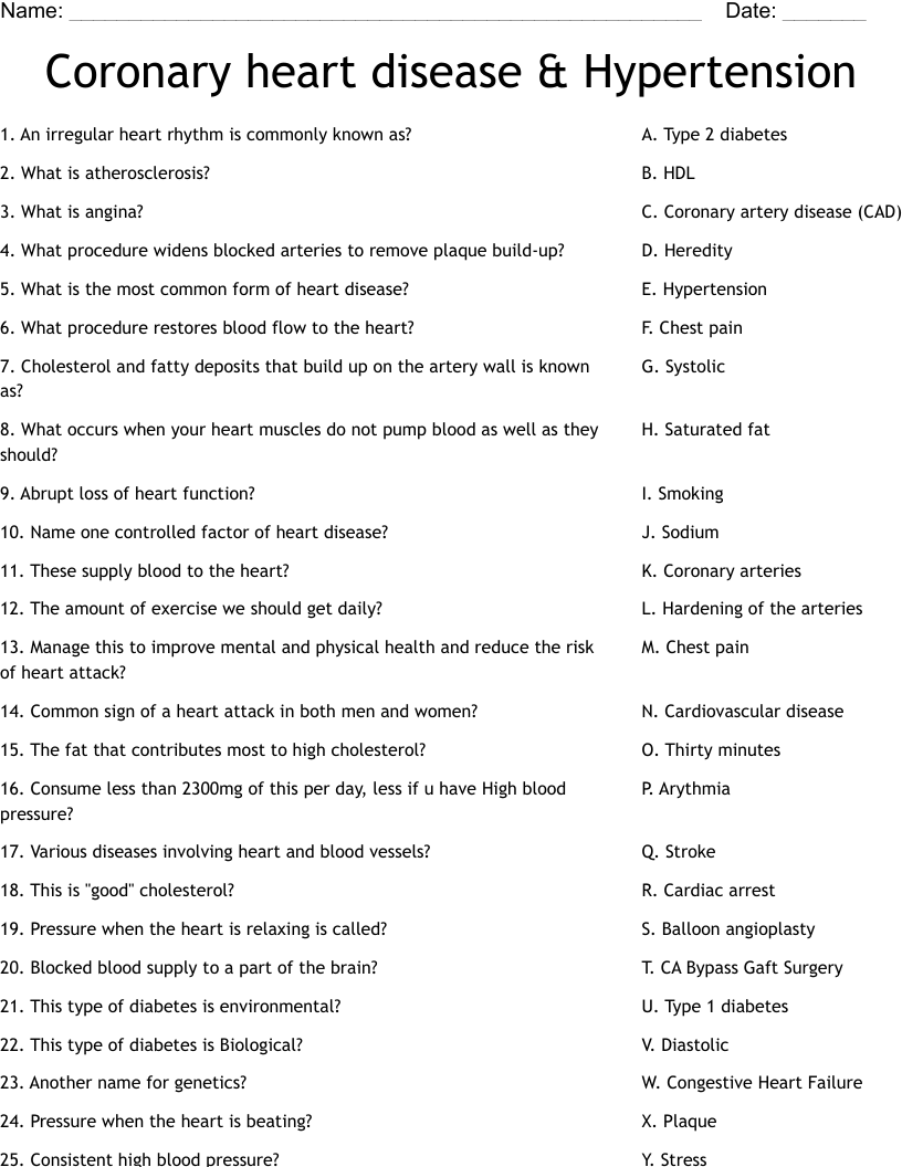 Coronary Heart Disease Hypertension Worksheet WordMint