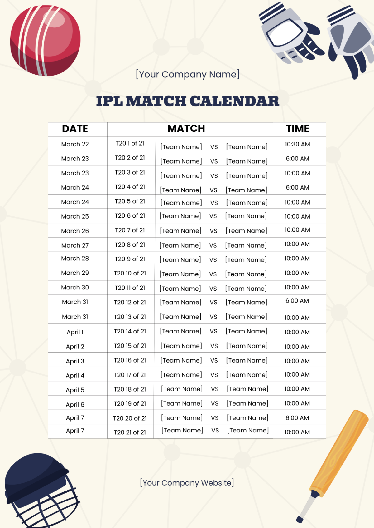 Free IPL Match Calendar Template To Edit Online