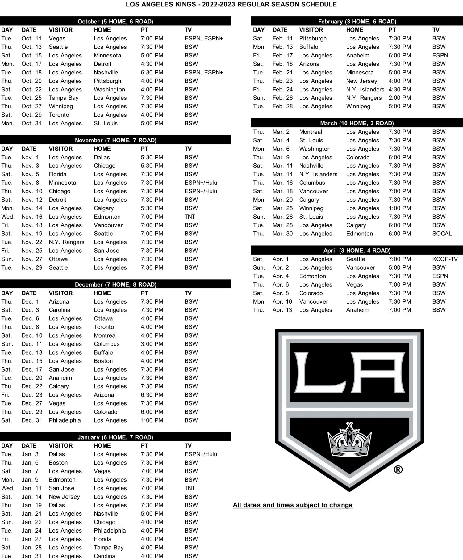 La Kings Schedule Home Printable