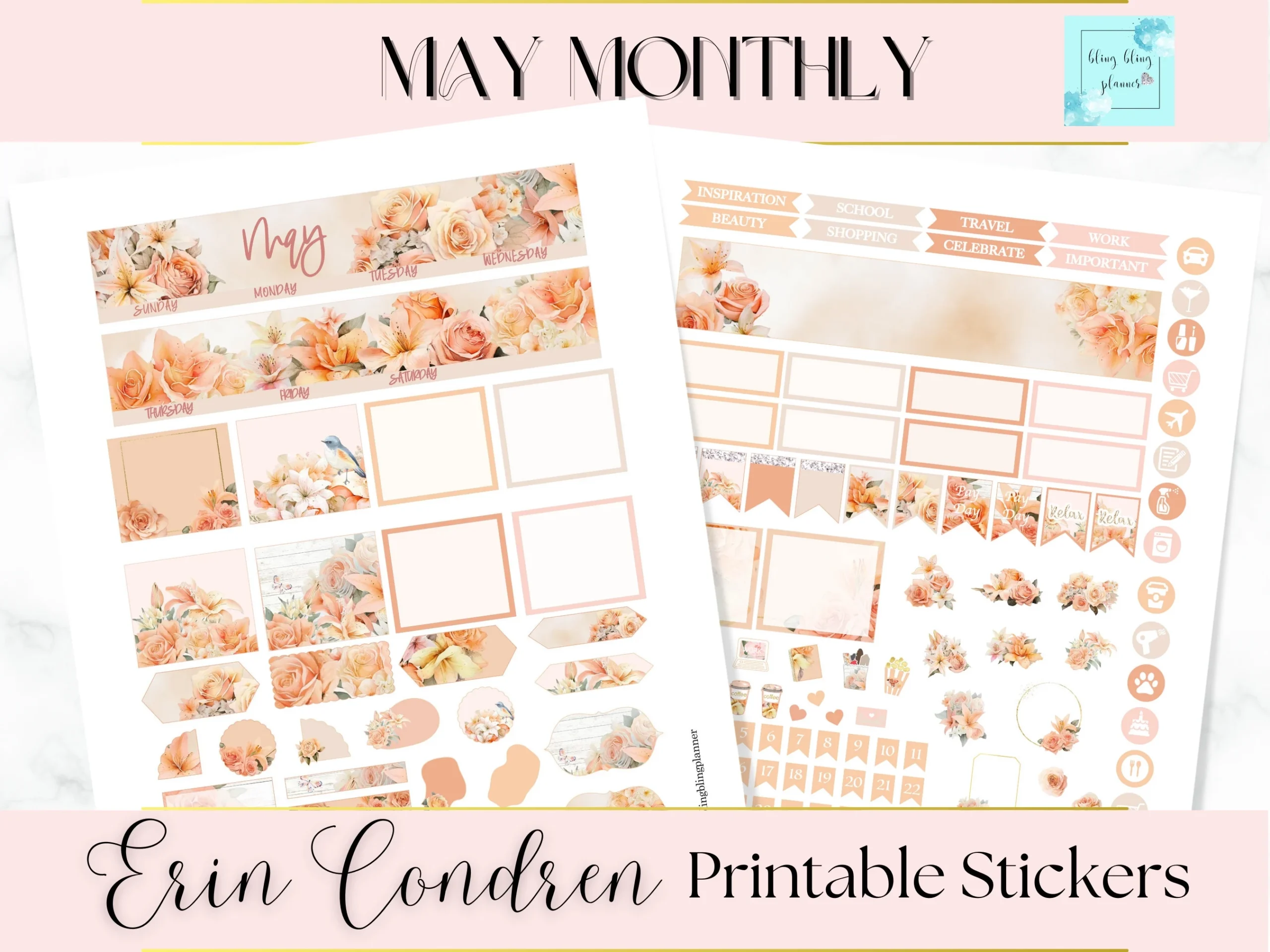 MAY MONTHLY PRINTABLE Sticker Flower Monthly View May Printable Monthly Sticker Kit Erin Condren May Monthly Floral Monthly Sticker Pack Etsy
