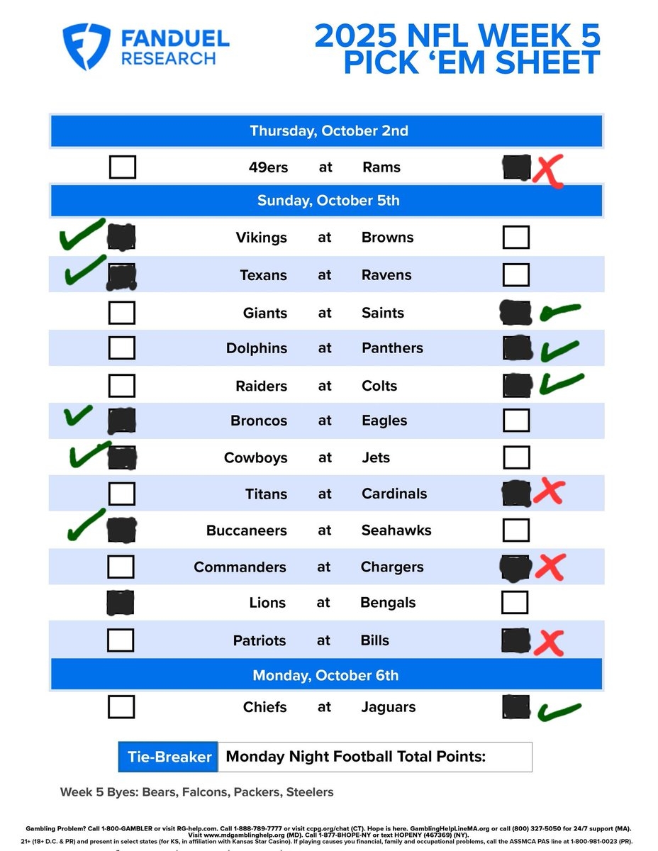 NFL Week 5 Pick Em Sheet Free Printable Schedule And Betting Odds FanDuel Research