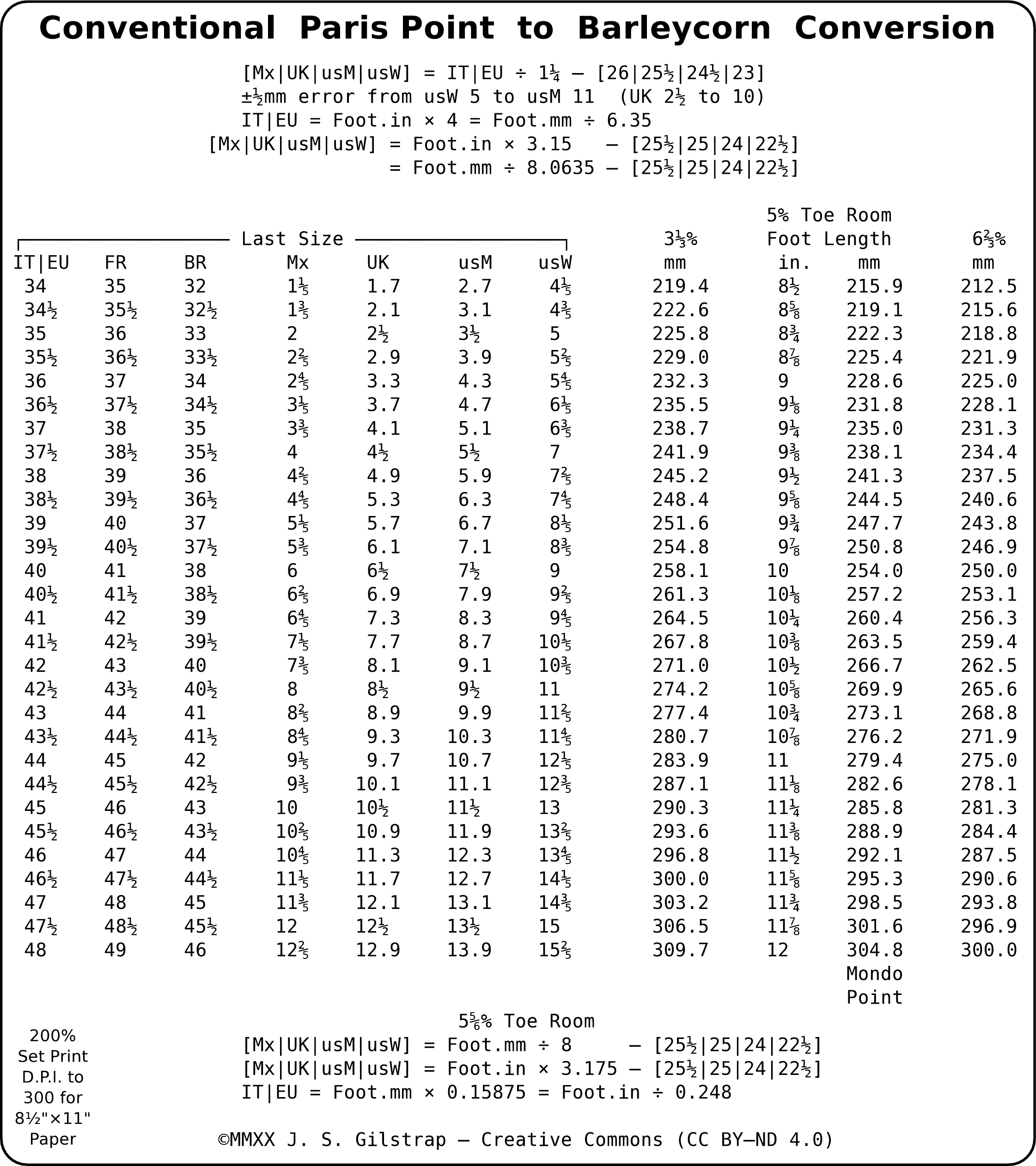 Printable Brannock Shoe Size Chart