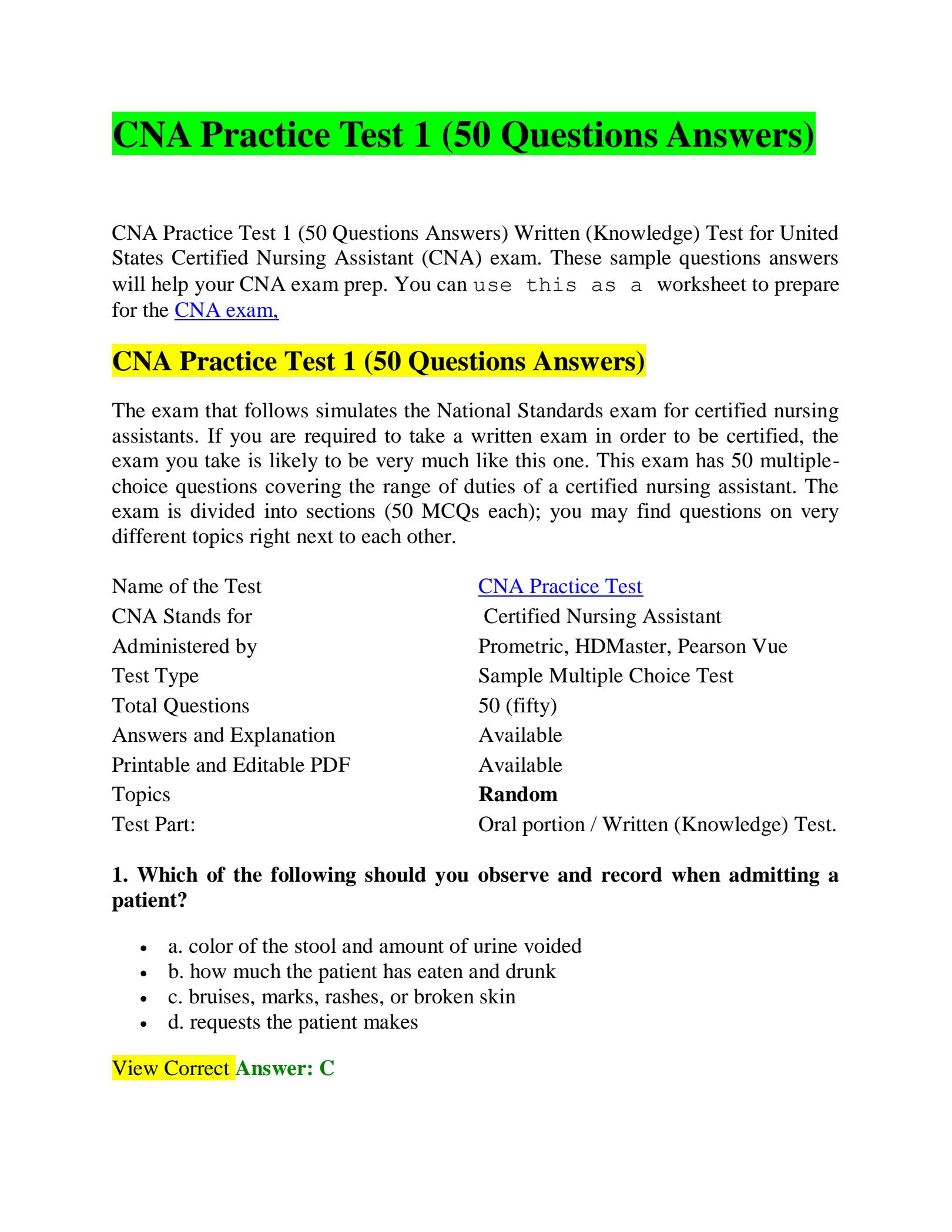 SOLUTION Cna Practice Test 1 50 Questions Answers Studypool