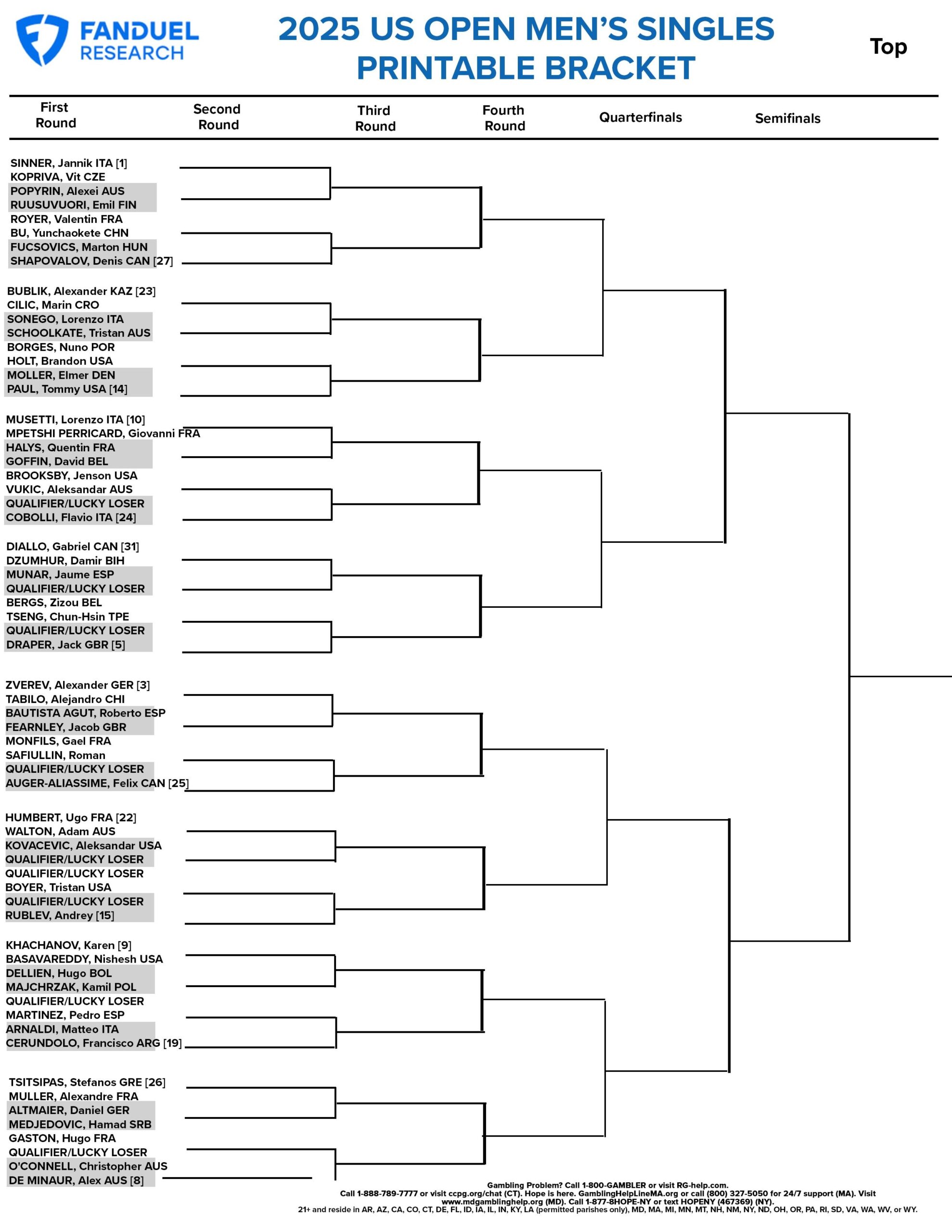 2025 US Open Men s Singles Draw Free Printable Bracket And Betting Odds FanDuel Research