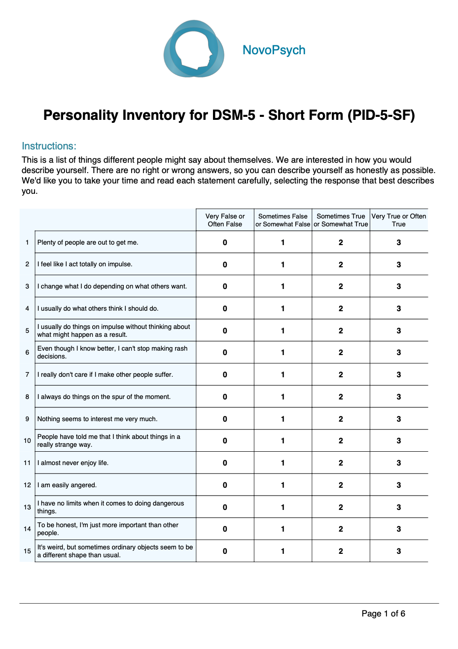 PID 5 SF Personality Inventory For DSM 5 Short Form